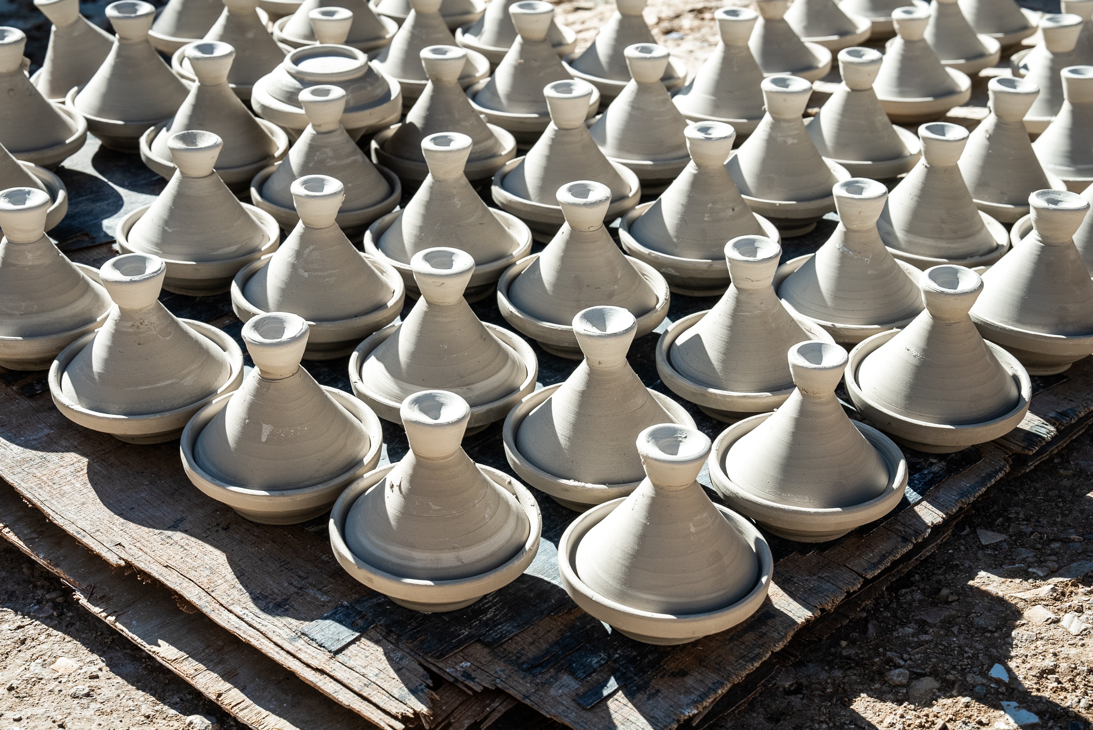 La confection d’une pièce nécessite en moyenne 12 jours, un voyage à travers le temps et le savoir-faire, débutant par le pétrissage minutieux de l’argile. Cette dernière est ensuite modelée sur un tour ou à l’aide d’un moule, marquant les premiers pas de sa transformation.Le processus se poursuit par un premier séchage au soleil, une méthode traditionnelle qui prépare l’argile pour les étapes suivantes. Après ce séchage, la pièce est soigneusement lissée et peaufinée, préparant le terrain pour une première cuisson. C’est à ce stade que nos artistes entrent en scène, armés de leur imagination et de leur dextérité, pour embellir chaque plat de dessins uniques, appliqués à la main avec une attention méticuleuse aux détails.