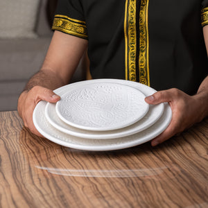 Découvrez l'assiette Zwak Miraj blanc, inspirée des motifs Amazigh. Avec ses rainures tactiles, elle apporte élégance et caractère à votre table, sublimant vos repas et ravissant vos convives.