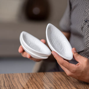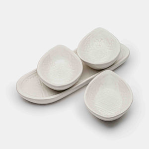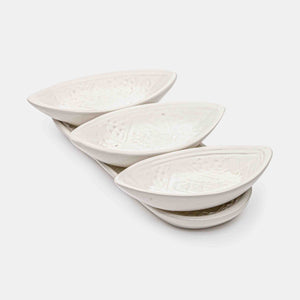 L'ensemble Bateau Miraj blanc, comportant trois coupelles en forme de barques, invite au voyage culinaire. Parfait pour présenter apéritifs et petits plats, il ajoute une touche de raffinement et d'élégance à votre table.