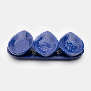 L'ensemble Bateau Miraj bleu, comportant trois coupelles en forme de barques, invite au voyage culinaire. Parfait pour présenter apéritifs et petits plats, il ajoute une touche de raffinement et d'élégance à votre table.